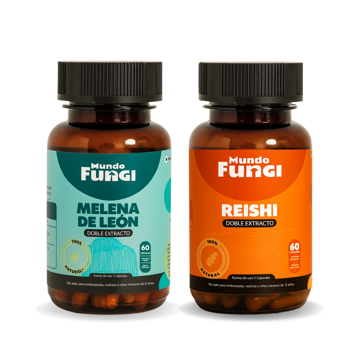 El Pack Estrés y Ansiedad Mundo Fungi combina Melena de León y Reishi en cápsulas para regular tu sistema nervioso, mejorar el enfoque y favorecer un descanso reparador, sin somnolencia diurna. Una ayuda natural para recuperar calma y claridad en tu rutina.